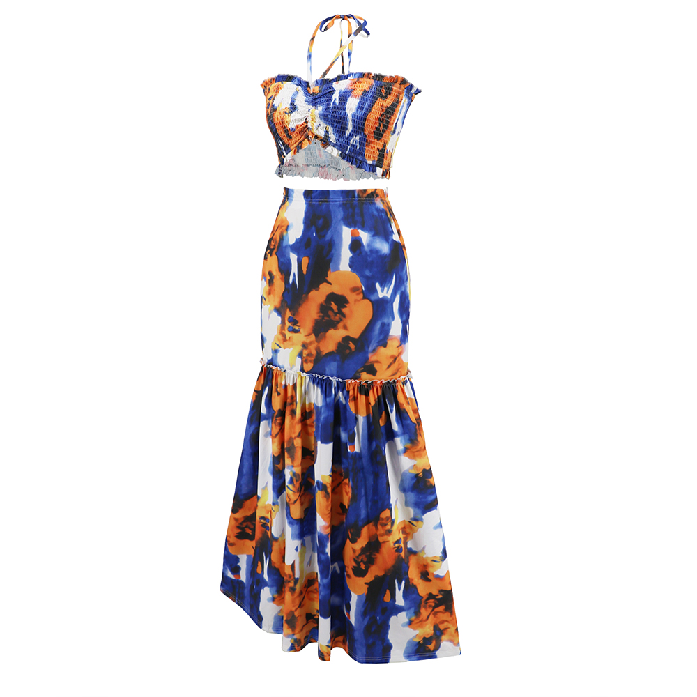 Features: Bohemian Floral Print. Two-Piece. Ruffle HEM.